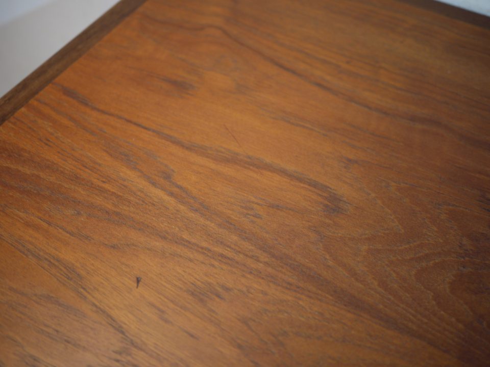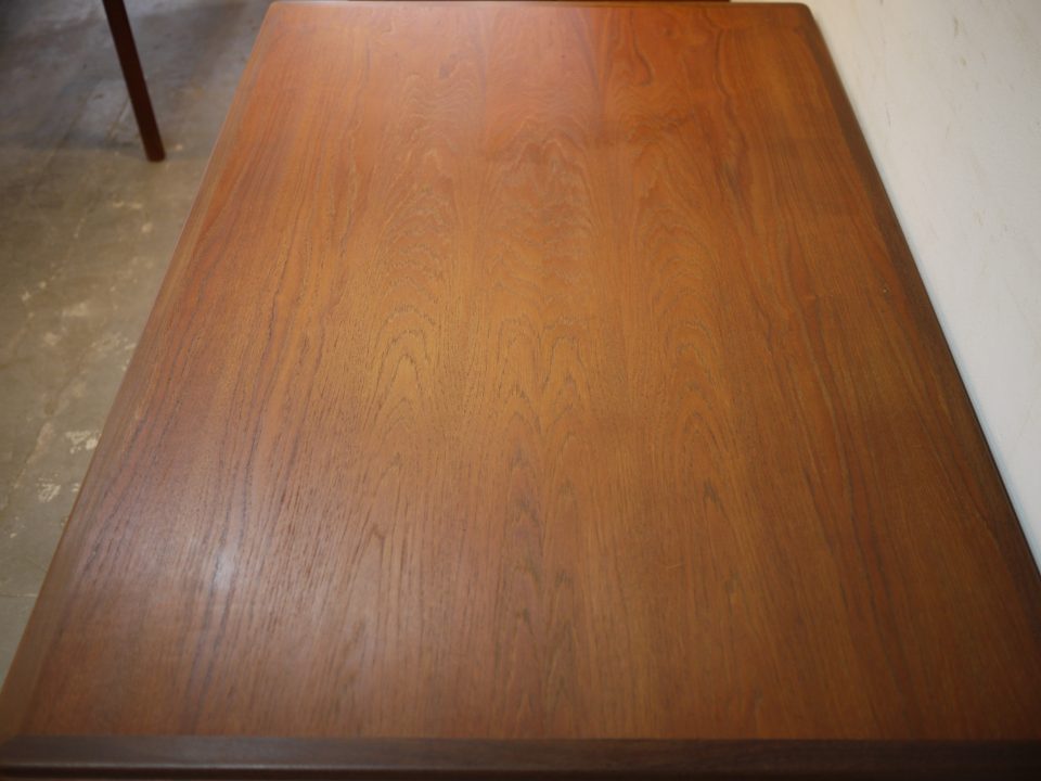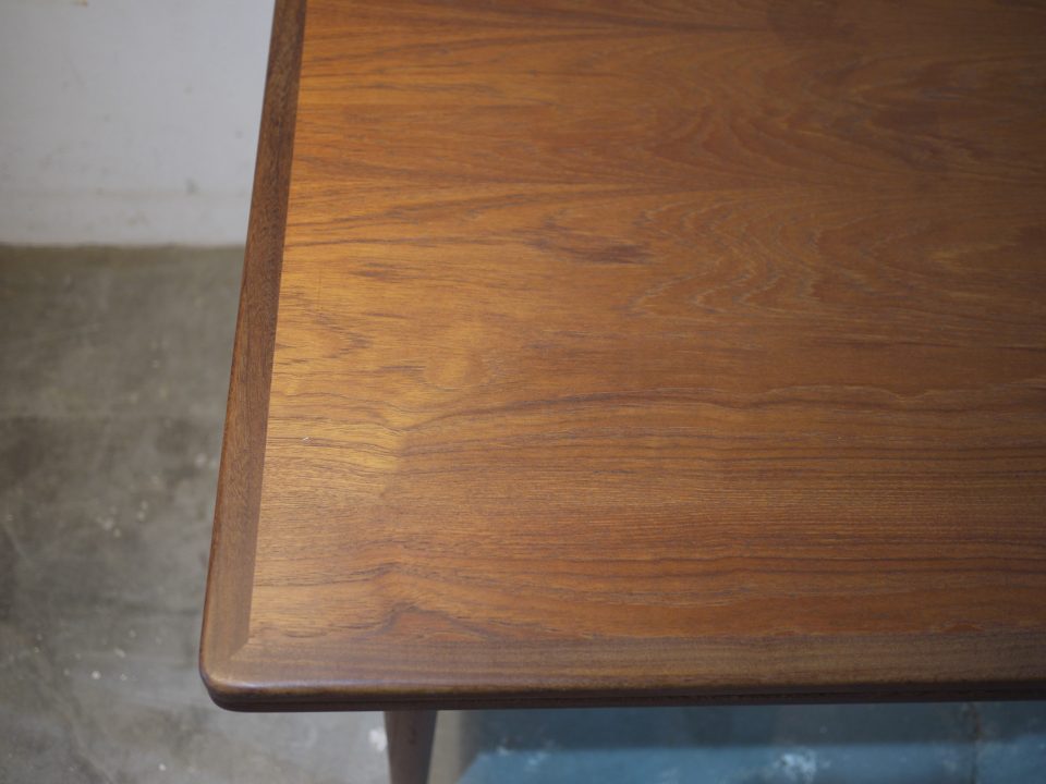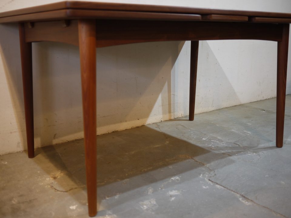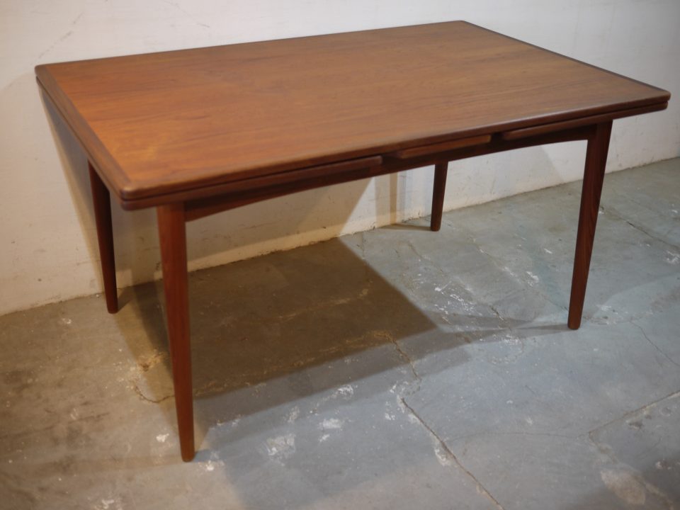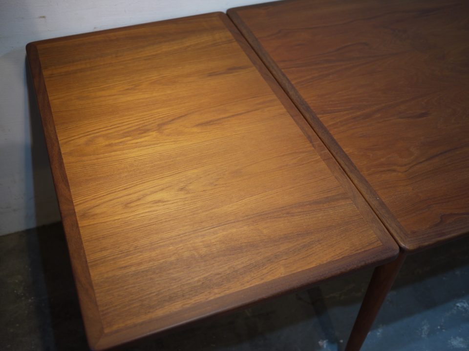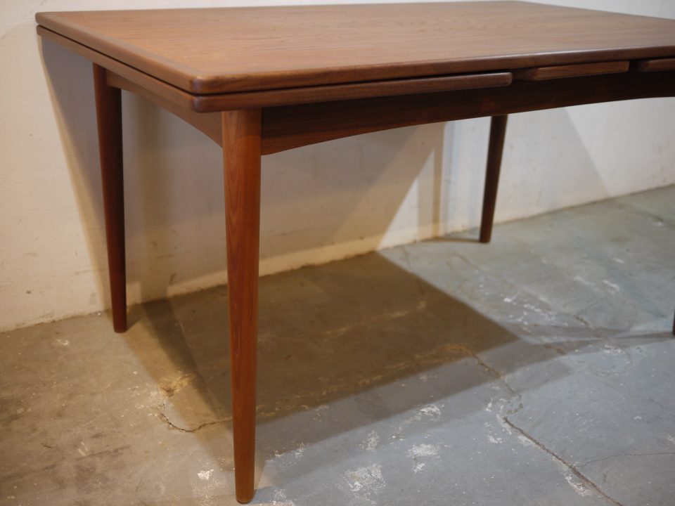 2026-02-21 16D-15 No 16D-15 DINING TABLE / TEAK W: 140cm D: 90cm H: 74cm (W53cmのエクステンション天板を2枚内蔵) PRICE : ¥ 201,300(税込) 姿の良い大きめなダイニングテーブルです。幕板はアーチ状にデザインされ、脚はハの字になるように取り付けられています。天板に細かい傷などがありますのでご確認いただければと思います。 Home › Furniture › 16D-15 関連記事 10B-7 15R-16 17S-4 17D-28 12S-11 16G-16 11S-4