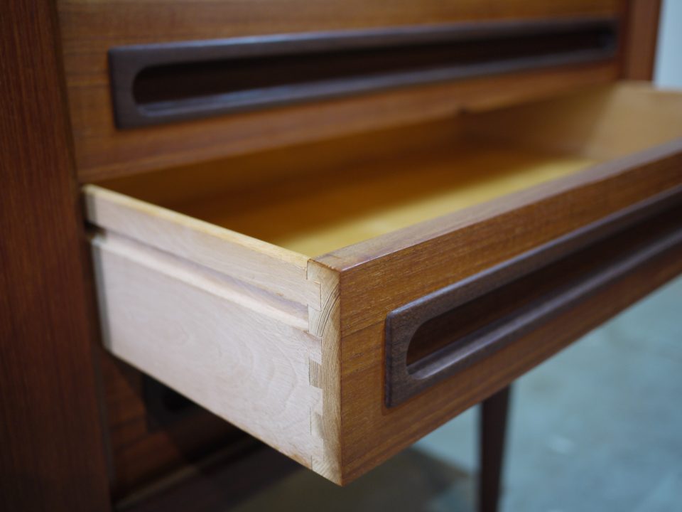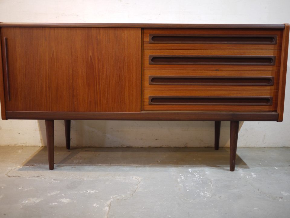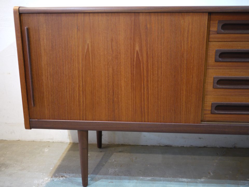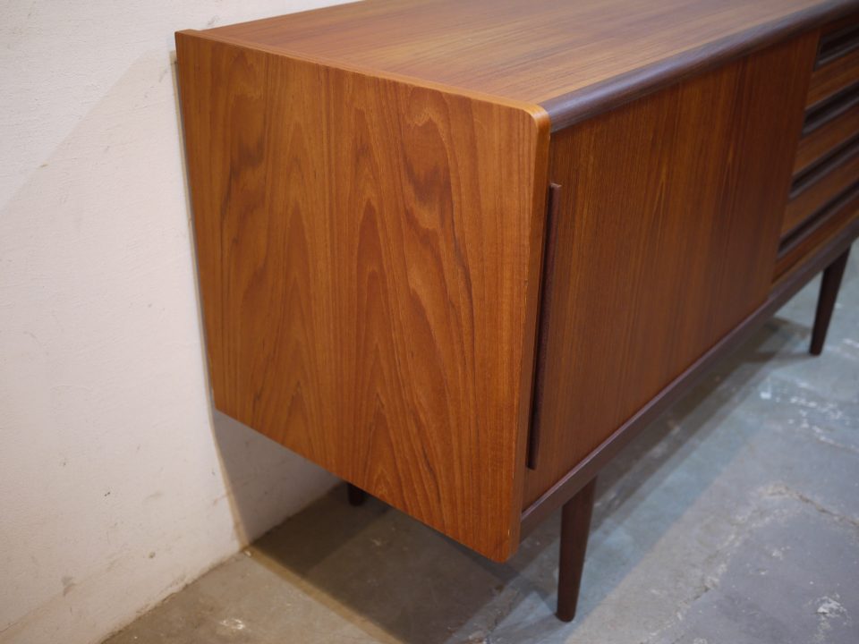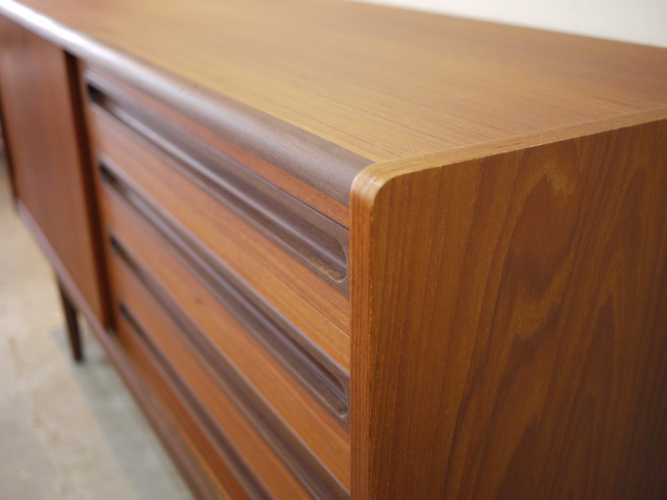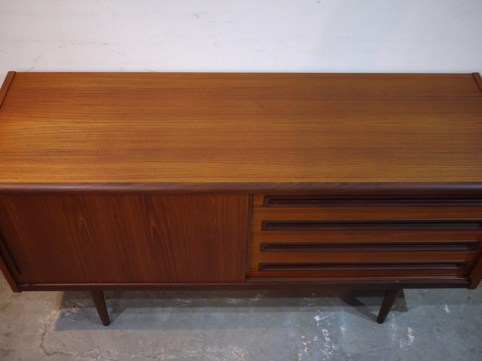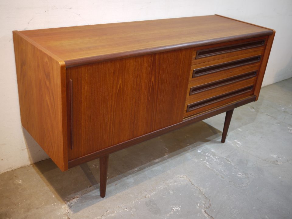 2026-02-21 17D-32 No 17D-32 SIDE BOARD / TEAK W: 152cm D: 50,5cm H: 81cm PRICE : ¥ 305,800(税込) パッと見目を引くデザイン性の高いサイドボードです。シンプルな作りですが全体的に丸みを帯びたラインと、引き出し部分のつまみのデザインが特徴的です。2段目の引き出しに少し欠けた部分があります。 Home › Furniture › 17D-32 関連記事 16D-7 17F-10 16G-7 16D-24 15R-3 17G-4